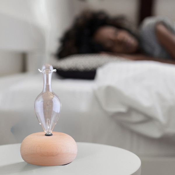 This spray diffuser has an FSC wood base and hand-crafted glassware, highlighted by LED lighting.