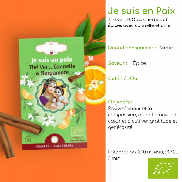 JE SUIS EN PAIX is an organic herbal tea combining the sweetness of green tea with the warmth of cinnamon and the enchanting notes of bergamot. This refined, spicy blend is designed to uplift the spirit and nourish inner joy. With carefully selected ingredients such as aniseed, cardamom and elderflower, this infusion evokes a sense of devotion and self-esteem, promoting a moment of deep reconnection. Each cup warms the heart and helps start the day with gratitude and inner peace.