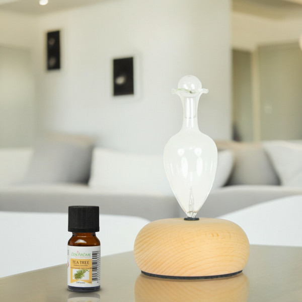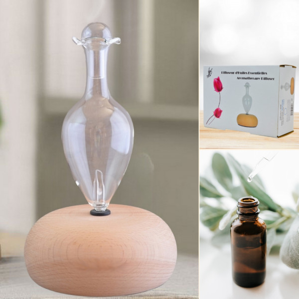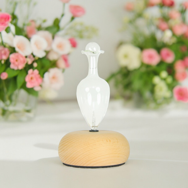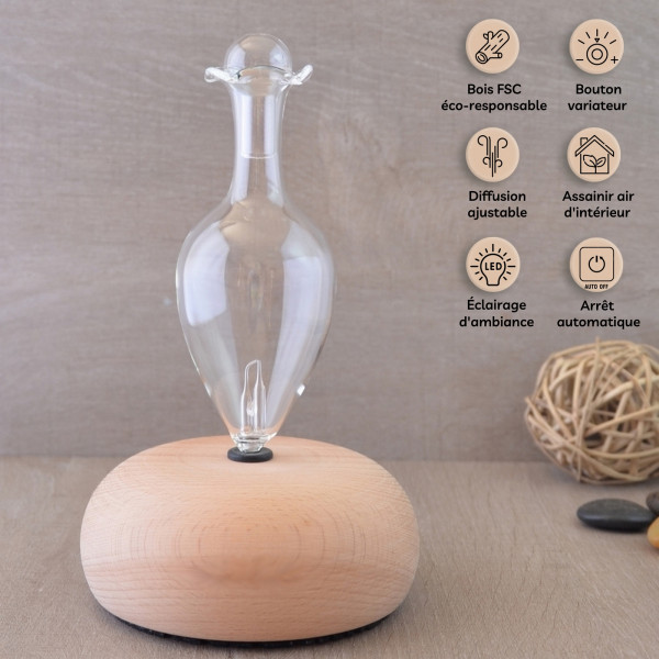 Ce diffuseur par nébulisation est composé d’une base en bois FSC et une verrerie artisanale mise en valeur par un éclairage LED blanc chaud.