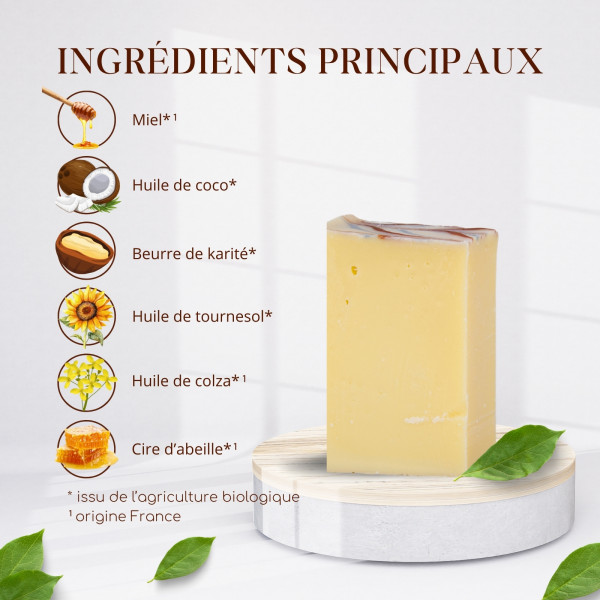 - Cire d'abeille et miel : Apportent des propriétés hydratantes et protectrices, idéales pour toute la famille.